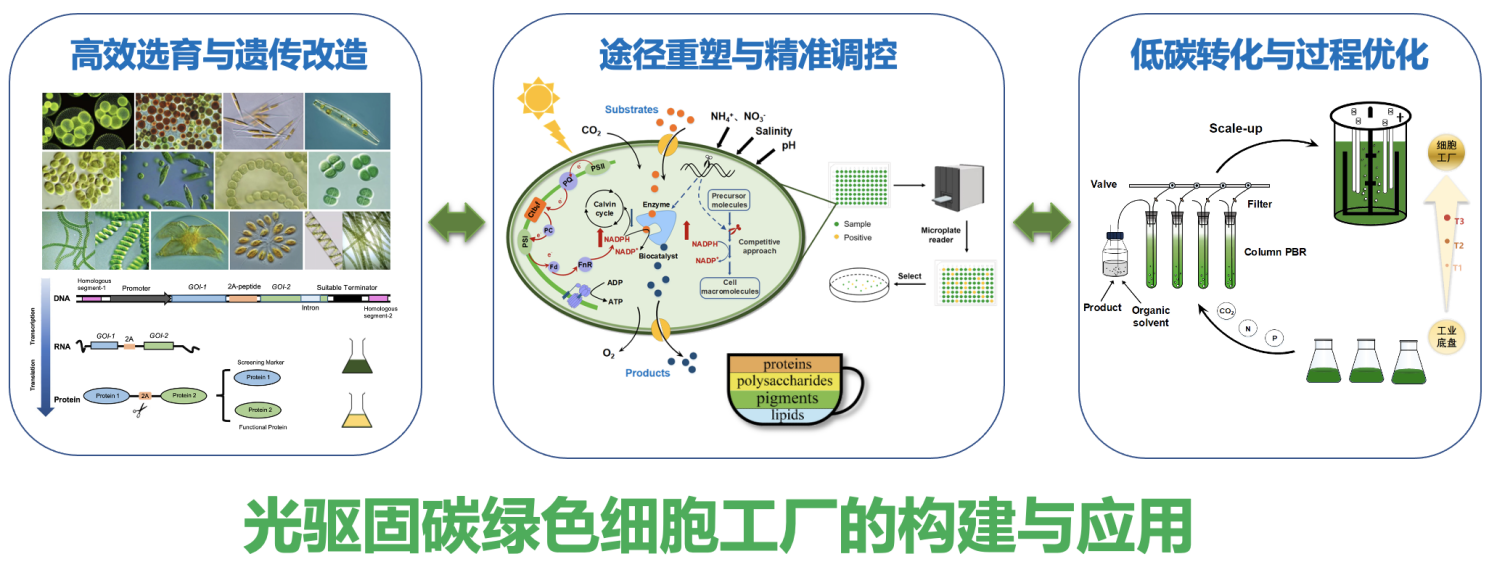 主要针对富含生物活性物质和高效环境修复的微藻优良种质,整合光合微藻底盘与人工半导体材料,定向优化电子传递通道,突破自然光合作用的效率限制,赋予其新功能。重点探索人工光合杂化体的设计与改造、营养与环境因素对生长及代谢影响、光合自养和光暗发酵过程中碳氮磷高效生物转化及优化调控,为生物活性物质生产、环境治理(碳减排和废水处理)与生物质利用、生物饵料与饲料、生物能源的开发提供绿色低碳关键技术。