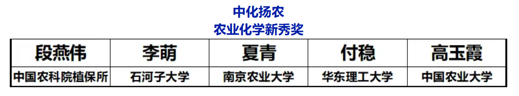 农业化学奖由中国化学会农业化学专业委员会设立。目前,由江苏扬农化工股份有限公司资助。农业化学新秀奖旨在奖励在农业化学及相关领域从事科学研究、年龄不超过35周岁的青年人才,获奖人须作为研究工作的负责人或第一完成人,以不超过3篇代表性论文和(或)专利(申请截止日前三年内正式发表或授权)作为主要评审依据。