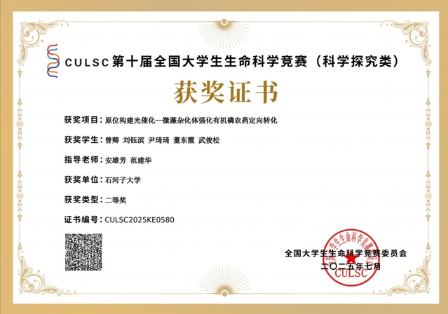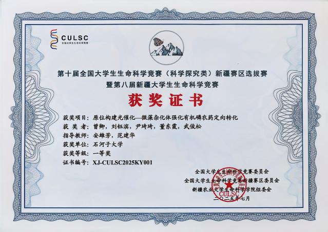 在备赛过程中,我院代表队以环境污染物的高效生物修复为切入点,筛选新疆本地微藻资源,原位构建了光催化-微藻杂化体,从而强化了有机磷农药的定向转化。参赛队伍设计了严谨的实验方案,开展了大量的实验研究和数据分析。团队成员在范建华、安雄芳两位老师的悉心指导下,克服诸多困难,最终完成高质量的研究作品。比赛过程中,团队成员通力协作,凭借扎实的专业知识、清晰的逻辑表达和敏捷的思维反应,赢得了评委们的高度认可。