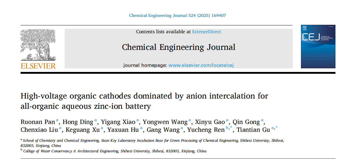 近日,我校化学化工学院谷天天副教授在水系锌离子电池高电压有机正极方面取得研究进展,相关研究成果以“High-voltage organic cathodes dominated by anion intercalation for all-organic aqueous zinc-ion battery”(以阴离子插层为主的高压有机正极用于全有机水系锌离子电池)为题,发表在Chemical Engineering Journal(中科院一区TOP期刊,IF=13.2)上,该工作是基于前期有机储锌正极材料的结构设计与机制研究上(Nano Research Energy 2024,3:e9120124;Chemical Engineering Journal 2025, ( 513) 162993; Journal of Colloid and Interface Science 685 (2025) 604–614)取得的重要进展。