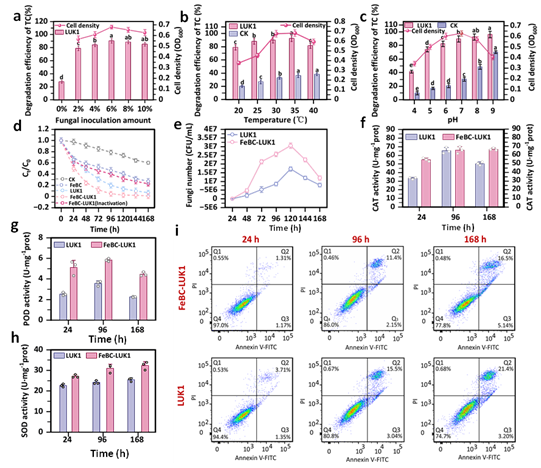 该系统展现出优异的降解性能与环境适应性。实验数据表明,FeBC-LUK1在168小时内对四环素的降解率达到99.09%,较游离LUK1的半衰期缩短40.90%,矿化率提升至81.10%。该材料在极端环境条件下仍保持优异性能:在pH 3-8范围内,降解效率达46.69%-89.70%在15-40℃条件下,降解效率保持在68.93%-97.66%,5%盐度下仍保持58.23%的降解效率,在5 mmol/L重金属离子共存下,对Cr和Co的降解效率分别提升62.9%和80.0%。