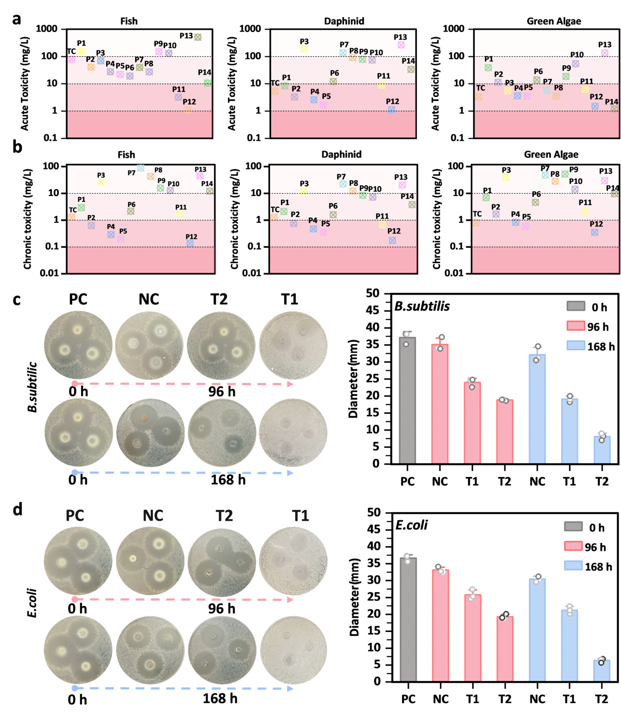 通过代谢产物分析,研究团队鉴定出14种中间产物,并提出了三条四环素降解路径:C4位点修饰(脱甲基化、脱酰胺化反应)、C6位点氧化裂解(涉及脱羟基化和开环反应)和协同脱官能团化(多步骤协同去除活性基团)。最终,四环素被转化为低毒性的直链化合物,并进一步矿化为CO₂和H₂O。生态毒性评估系统证实了降解过程的高效解毒效果。结果表明,代表性终产物P13(直链化合物)对鱼类的急性毒性较母体四环素大幅降低,其半数致死浓度(LC50)从78.5 mg/L提升至511 mg/L,根据分类标准已由“有毒”降至“无害”。同时,对绿藻的慢性毒性评估也显示,慢性毒性值(ChV)从0.789 mg/L提升至29.6 mg/L,表明其对水生生态系统的长期风险已得到有效控制。此外,降解产物对大肠杆菌和枯草芽孢杆菌的抑菌圈直径分别减小了78.33%和82.47%,证明其固有的抗生素活性已基本被破坏。