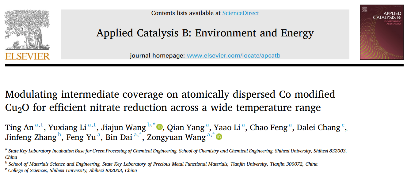 该研究为宽温域电催化剂设计提供了全新的原子级机理认知和实用策略,有力推动了电催化硝酸盐还原制氨的实际工程化应用。相关成果以“Modulating intermediate coverage on atomically dispersed Co modified Cu2O for efficient nitrate reduction across a wide temperature range”为题,发表在环境与能源领域顶级期刊Applied Catalysis B: Environment and Energy上(Appl. Catal. B: Environ. 389 (2026) 126600; https://doi.org/10.1016/j.apcatb.2026.126600),论文第一作者为石河子大学化学化工学院博士生安婷、李宇翔,通讯作者为石河子大学代斌教授、王宗元副教授和天津大学王嘉骏副研究员。