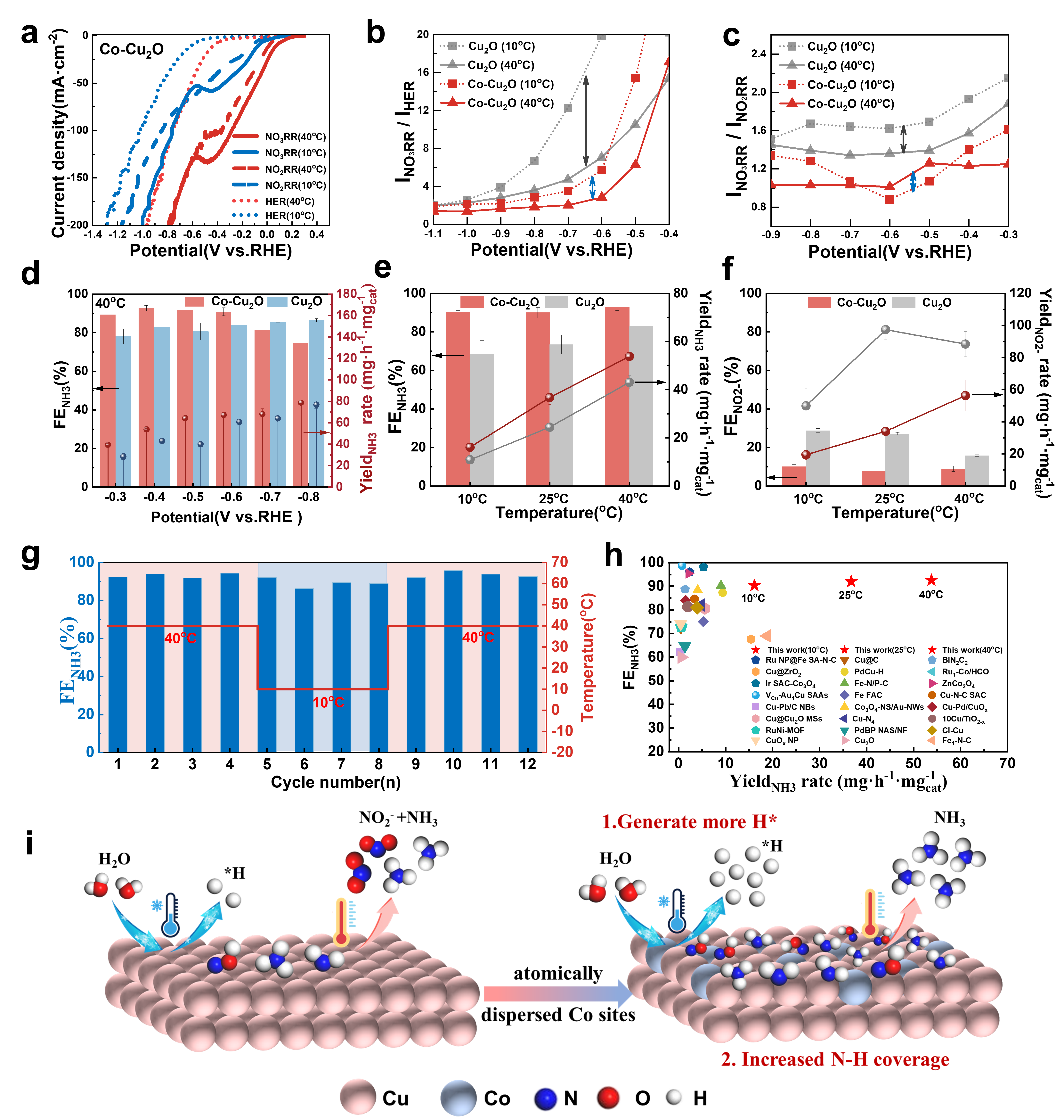 图5. Co-Cu2O与Cu2O的硝酸盐还原性能对比及宽温域催化机理