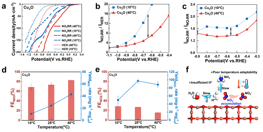 为找到温度影响催化性能的核心症结,研究团队以NO3RR研究中应用广泛的Cu2O为模型催化剂展开系统研究,首次清晰揭示了10-40℃范围内,纯Cu2O上NO3RR、NO2RR和HER三条反应路径的竞争机制,通过INO₃RR/IHER和INO₃RR/INO₂RR两个描述符观察温度变化引起的性能波动。研究发现,纯Cu2O升温时虽氨产率有所提升,但亚硝酸盐累积问题突出,催化选择性随温度大幅变化,不适用于工业生产的稳定输出需求。