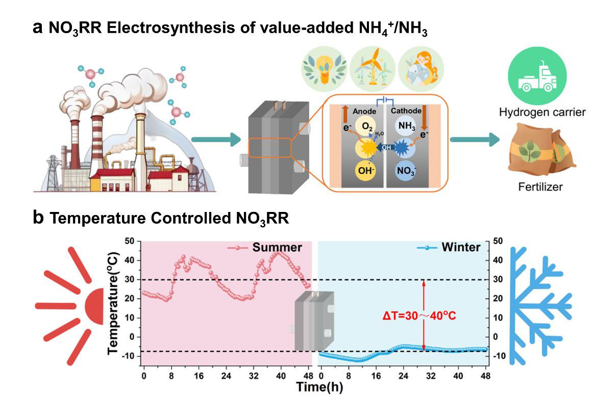 图1.电催化硝酸盐还原制氨原理及实际温度波动特征