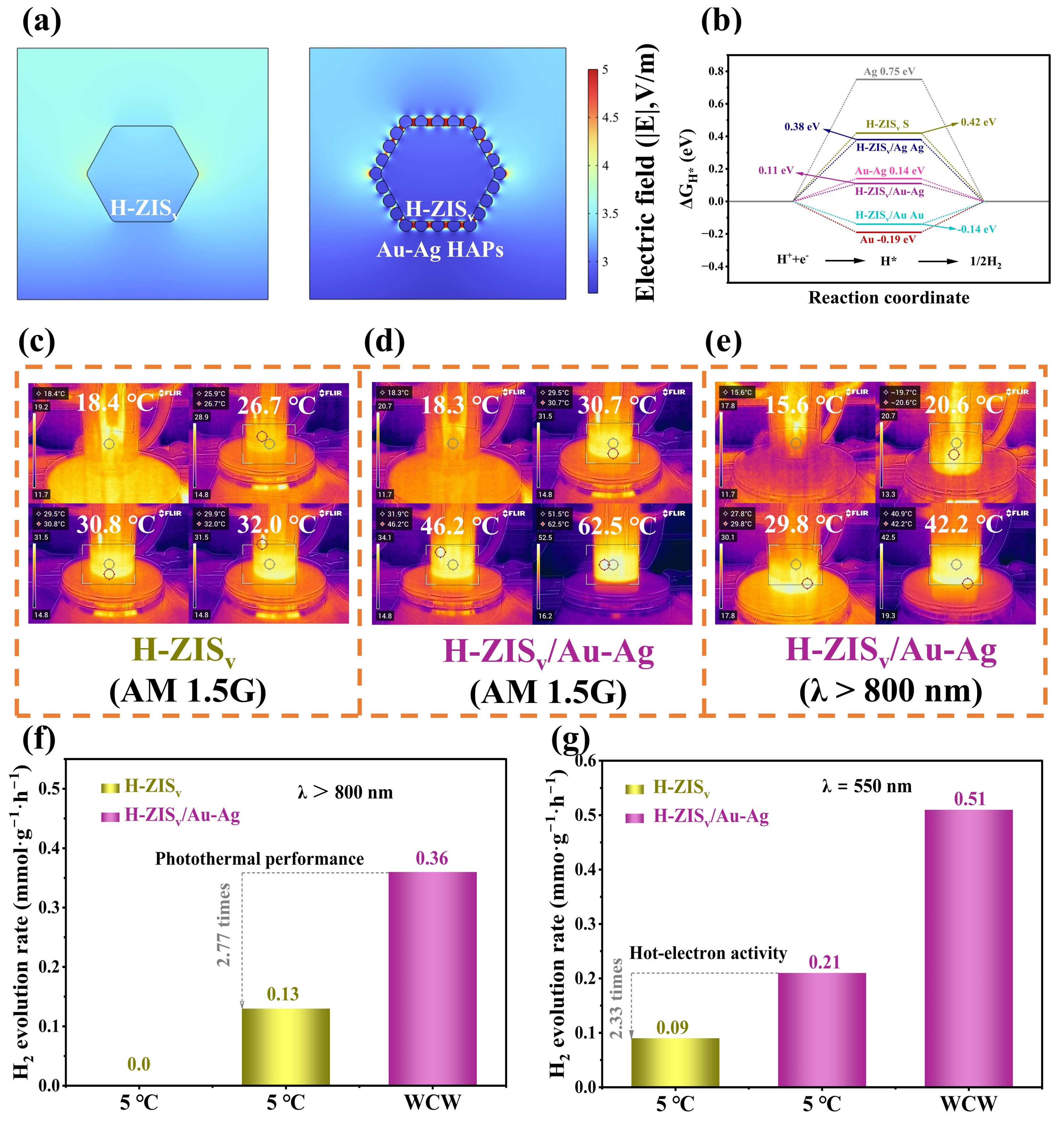 图2.(a)H-ZISv和H-ZISv/Au-Ag模拟电场的空间分布;(b)氢在不同表面位置吸附的ΔGH*值;不同光激发条件下(c)H-ZISv和(d,e)H-ZISv/Au-Ag反应过程的光热红外图像;光催化析氢中的(f)光热性能和(g)热电子活性的量化。
