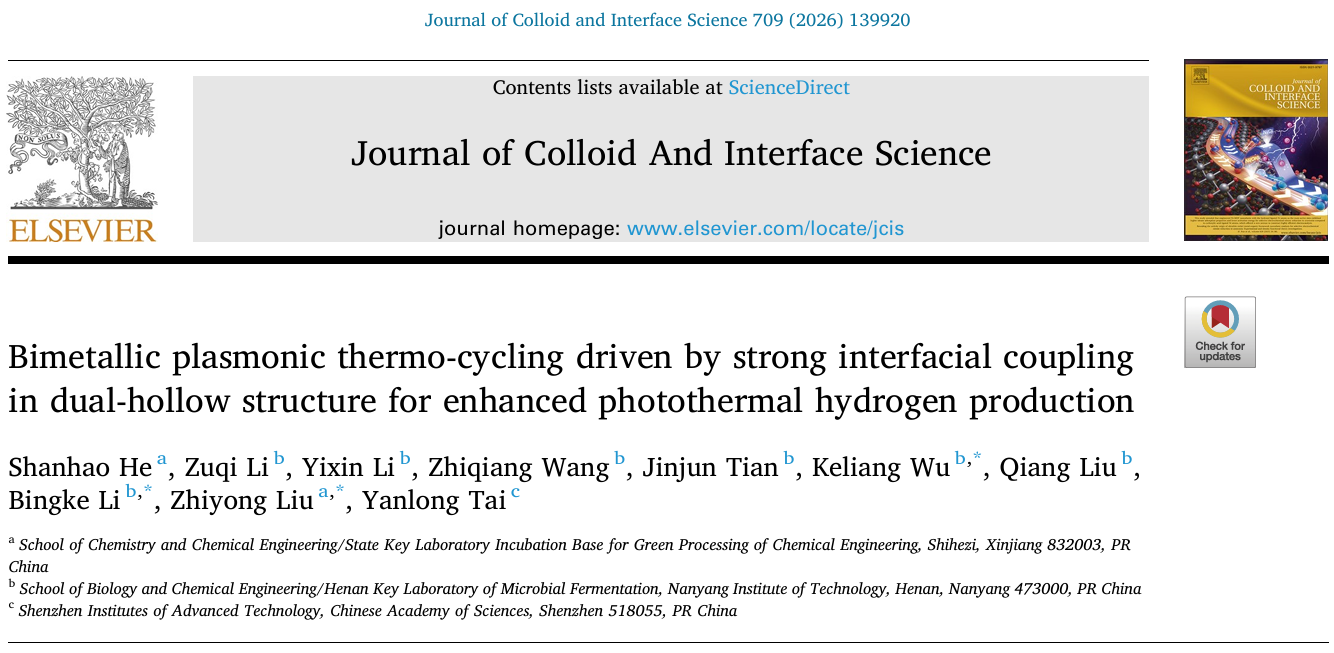 近日,石河子大学刘志勇教授和南阳理工学院吴可量副教授团队在光热催化水产氢(PTHE)领域取得突破性研究成果,相关研究以“Bimetallic plasmonic thermo-cycling driven by strong interfacial coupling in dual-hollow structure for enhanced photothermal hydrogen production”(双空心结构中强界面耦合驱动的双金属等离子体热循环促进光热制氢)为题,发表在国际权威期刊《Journal of Colloid And Interface Science》上。