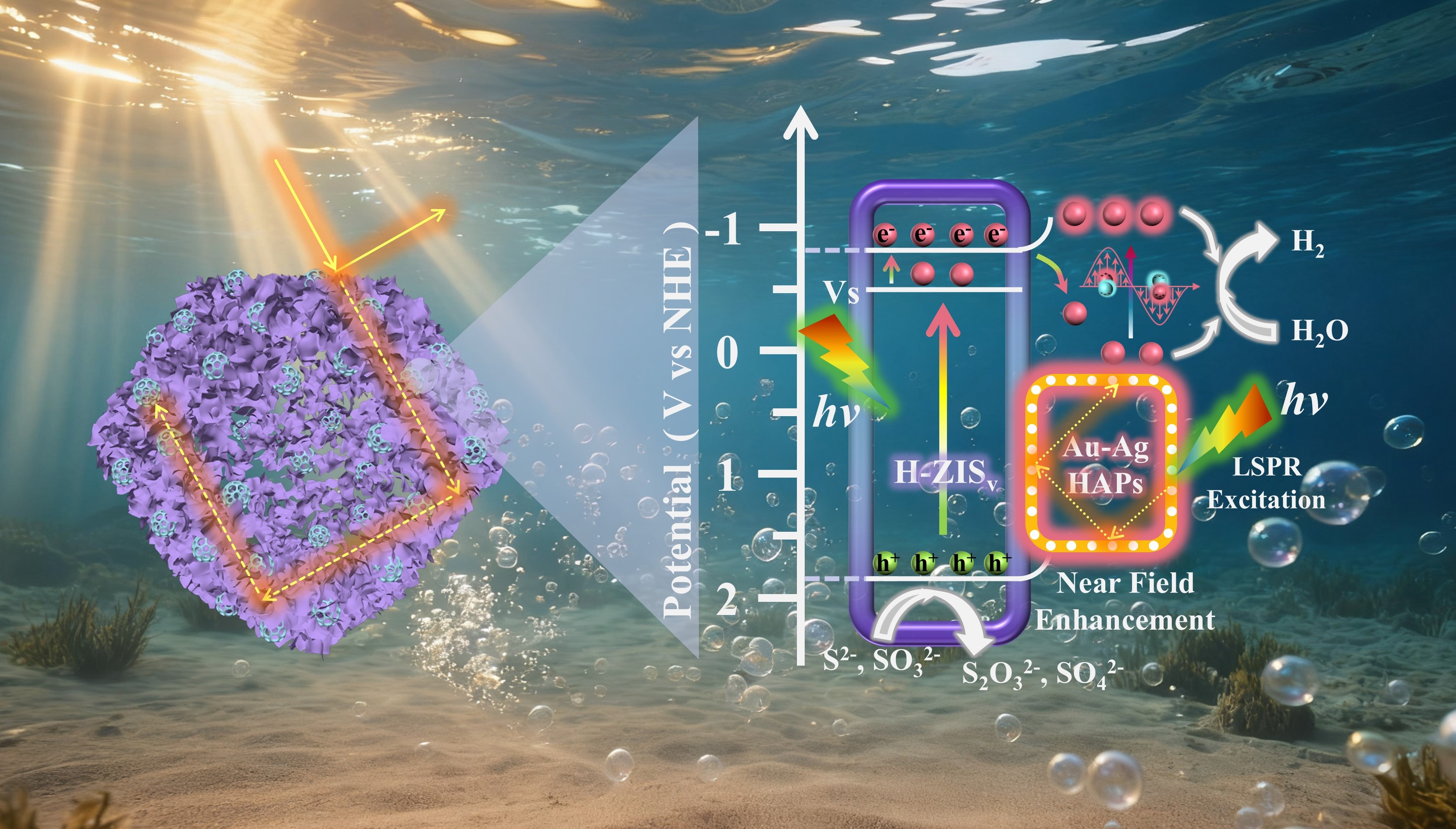 图1.基于软模板结构,构筑双中空H-ZISv/Au-Ag肖特基结,硫空位的引入增强了H-ZISv与Au-Ag HAPs的界面耦合。光生电子一方面由H-ZISv快速向Au-Ag HAPs迁移产氢,另一方面迁移到Au-Ag HAPs的电子通过LSPR效应被直接激发成热电子协同产氢。同时非辐射弛豫产生的热被限制在双中空腔内,提高了H-ZISv/Au-Ag内的局部温度,温度的升高提高了等离子体激发的效率,建立了一个闭环系统,造成了光能、化学能和热能相互增强(“等离子体热循环”机制)。