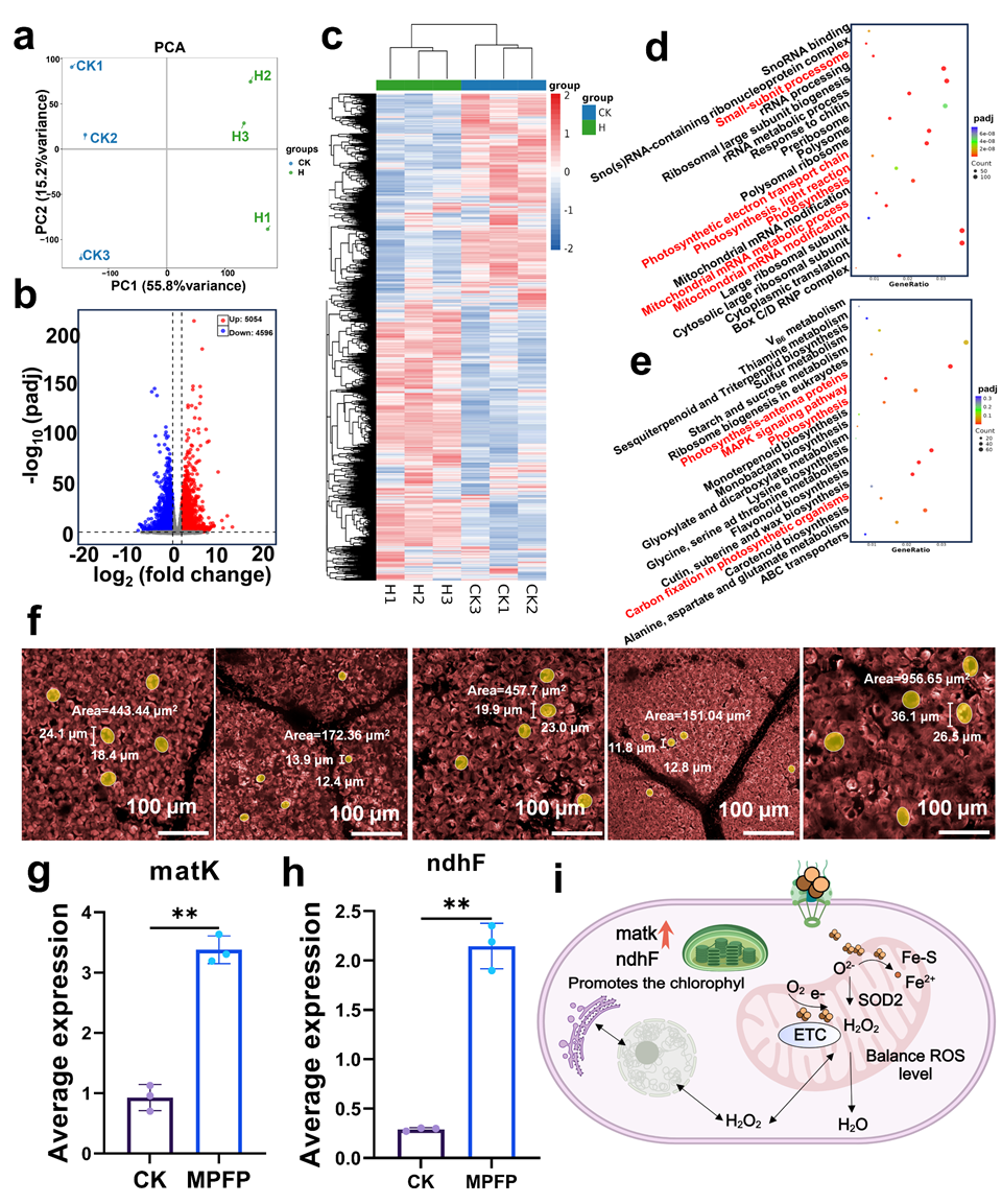 在棉花模型中,MPFP-HAMNs展现出显著的促生长和抗逆效果。与对照组相比,处理后植株株高提高34.1%,叶绿素含量增加35.7%,干重和鲜重分别提升9.5%和37.8%。进一步的转录组学结果表明,该体系能够显著调控与光合作用、核糖体生物合成、应激响应及MAPK信号通路相关的基因表达,并维持叶绿体标志基因的稳定,从分子层面解释了其促进植物生长和增强热胁迫耐受性的机制。