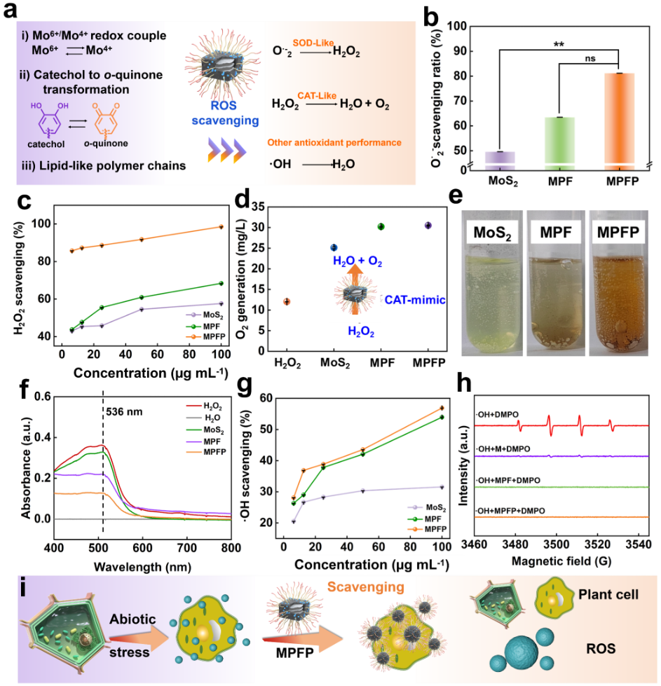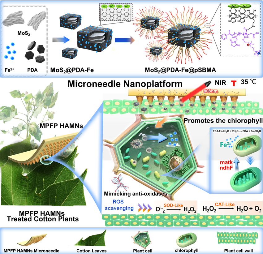 该研究构建的核心体系为负载MPFP纳米酶的可溶解透明质酸微针阵列(MPFP-HAMNs)。其中,MPFP由Fe2+掺杂聚多巴胺与两性离子聚合物修饰的MoS₂纳米片组成,兼具光热转化、离子释放与仿生酶催化等多重功能;透明质酸微针则作为可溶解载体,负责穿透植物叶片角质层并完成原位递送。该微针阵列能够贴合叶片表面并在数秒内完成穿透和溶解,将功能纳米酶有效递送至叶肉组织,建立稳定高效的植物-材料生物界面。从材料设计上看,这一体系体现出鲜明的多组分协同特征。MoS2提供了纳米酶活性基础,聚多巴胺赋予体系优异的近红外响应能力,Fe2+作为关键营养元素参与叶绿素生物合成,而两性离子聚合物则有助于提升体系分散性、稳定性及界面相容性。多组分集成后,材料不仅实现了温和光热响应下的按需释放,同时还具备明显的 SOD/CAT样仿酶活性,可高效清除活性氧物种。