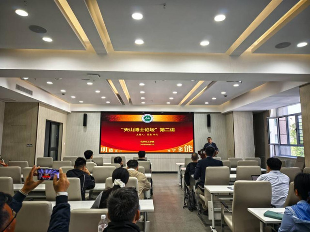 2026年4月21日下午,“天山博士论坛”第二讲在创新楼203会议室举行。本次论坛由贾鑫书记主持。论坛开始前,贾鑫书记围绕科学家精神作了专题分享,强调要以党建引领学术方向、融入科研创新全链条,构建党建加学术交流的工作格局,鼓励青年学者胸怀“国之大者”,在关键核心技术领域勇闯“无人区”、敢啃“硬骨头”。